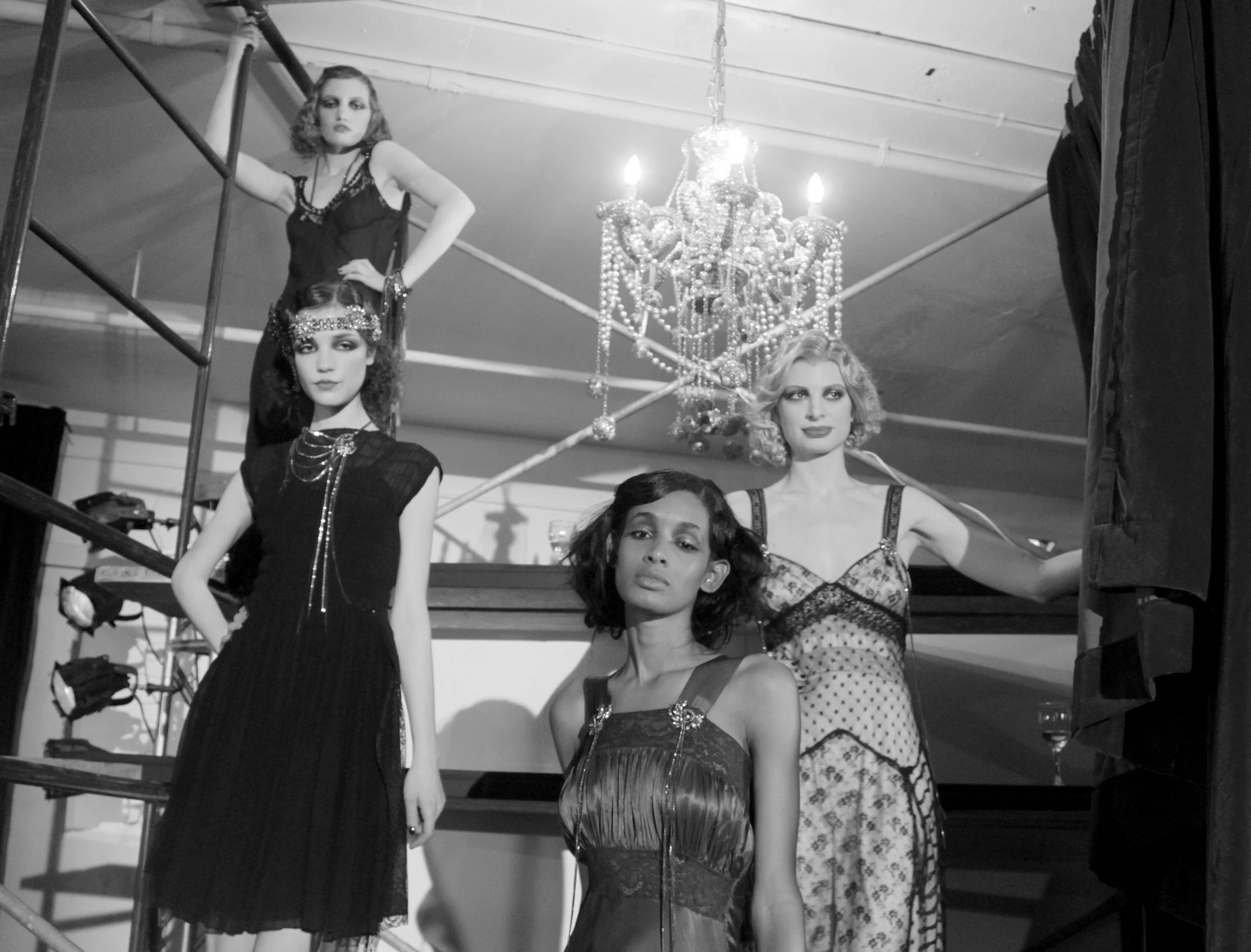 “We wanted to do a presentation where people were dancing, so I thought, well then we’re going to have to make the clothes,” said Beamon. “We didn’t know how to make jewelry when we started years ago, so it didn’t matter that we had never done it.” The event, held on the 8th floor of Milk Studios, was a raucous celebration, where The Citizens Band played swinging jazz-era music on a stage set like an old nightclub. Models danced on tables, swilled champagne and let loose.